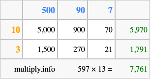 That's all there is to it! As you can see from the box above, the answer to 597 times 13 using the box method is 7,761.