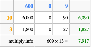 That's all there is to it! As you can see from the box above, the answer to 609 times 13 using the box method is 7,917.