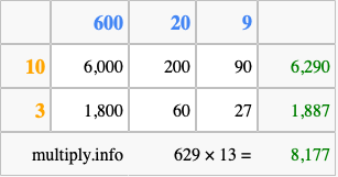 Below is an illustration showing you how to calculate 629 times 13 using the box method, using the instructions above.