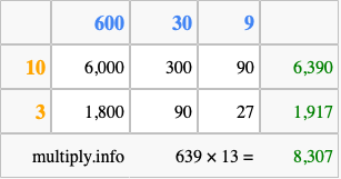 That's all there is to it! As you can see from the box above, the answer to 639 times 13 using the box method is 8,307.