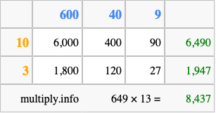 That's all there is to it! As you can see from the box above, the answer to 649 times 13 using the box method is 8,437.