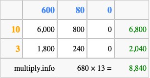 That's all there is to it! As you can see from the box above, the answer to 680 times 13 using the box method is 8,840.