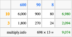Below is an illustration showing you how to calculate 698 times 13 using the box method, using the instructions above.