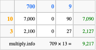 Below is an illustration showing you how to calculate 709 times 13 using the box method, using the instructions above.