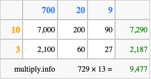 That's all there is to it! As you can see from the box above, the answer to 729 times 13 using the box method is 9,477.
