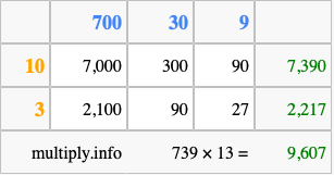 That's all there is to it! As you can see from the box above, the answer to 739 times 13 using the box method is 9,607.