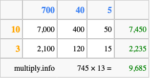 Finally, we add up all the sums we found in step 3 to get our final answer to 745 times 13.