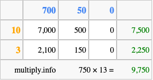 Below is an illustration showing you how to calculate 750 times 13 using the box method, using the instructions above.