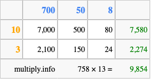 Below is an illustration showing you how to calculate 758 times 13 using the box method, using the instructions above.