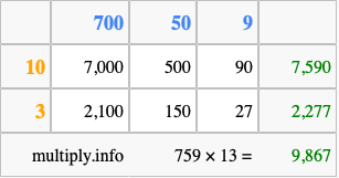 Below is an illustration showing you how to calculate 759 times 13 using the box method, using the instructions above.