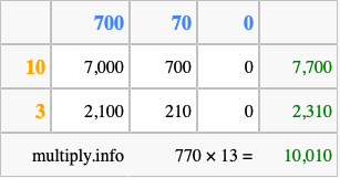 Below is an illustration showing you how to calculate 770 times 13 using the box method, using the instructions above.