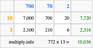 Finally, we add up all the sums we found in step 3 to get our final answer to 772 times 13.