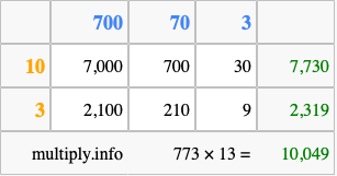 Below is an illustration showing you how to calculate 773 times 13 using the box method, using the instructions above.