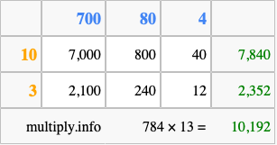 Finally, we add up all the sums we found in step 3 to get our final answer to 784 times 13.