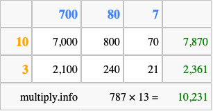 Finally, we add up all the sums we found in step 3 to get our final answer to 787 times 13.