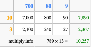 Finally, we add up all the sums we found in step 3 to get our final answer to 789 times 13.