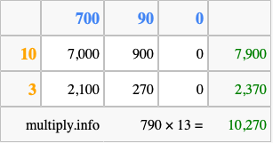 That's all there is to it! As you can see from the box above, the answer to 790 times 13 using the box method is 10,270.