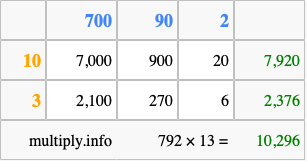 That's all there is to it! As you can see from the box above, the answer to 792 times 13 using the box method is 10,296.