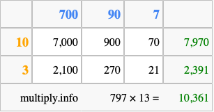 Finally, we add up all the sums we found in step 3 to get our final answer to 797 times 13.