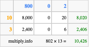 Finally, we add up all the sums we found in step 3 to get our final answer to 802 times 13.