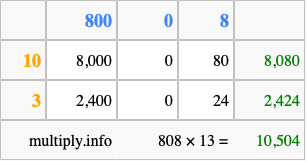 Finally, we add up all the sums we found in step 3 to get our final answer to 808 times 13.