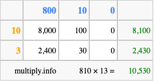 Below is an illustration showing you how to calculate 810 times 13 using the box method, using the instructions above.