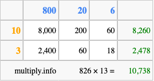 Below is an illustration showing you how to calculate 826 times 13 using the box method, using the instructions above.