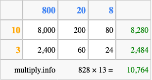 Finally, we add up all the sums we found in step 3 to get our final answer to 828 times 13.