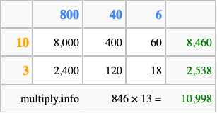 Below is an illustration showing you how to calculate 846 times 13 using the box method, using the instructions above.