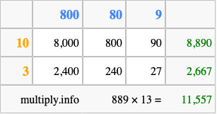 That's all there is to it! As you can see from the box above, the answer to 889 times 13 using the box method is 11,557.