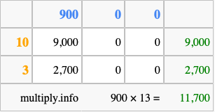 That's all there is to it! As you can see from the box above, the answer to 900 times 13 using the box method is 11,700.