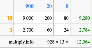 Finally, we add up all the sums we found in step 3 to get our final answer to 928 times 13.