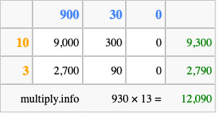 That's all there is to it! As you can see from the box above, the answer to 930 times 13 using the box method is 12,090.