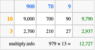 Below is an illustration showing you how to calculate 979 times 13 using the box method, using the instructions above.