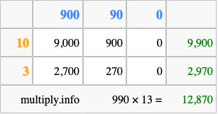 That's all there is to it! As you can see from the box above, the answer to 990 times 13 using the box method is 12,870.