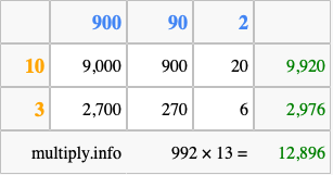 That's all there is to it! As you can see from the box above, the answer to 992 times 13 using the box method is 12,896.
