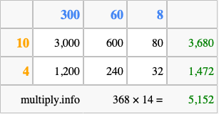 Finally, we add up all the sums we found in step 3 to get our final answer to 368 times 14.