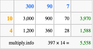 Finally, we add up all the sums we found in step 3 to get our final answer to 397 times 14.