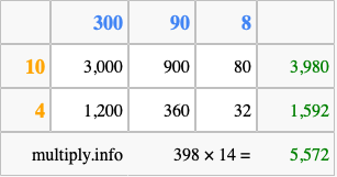 Below is an illustration showing you how to calculate 398 times 14 using the box method, using the instructions above.