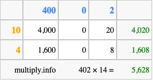 That's all there is to it! As you can see from the box above, the answer to 402 times 14 using the box method is 5,628.