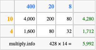 That's all there is to it! As you can see from the box above, the answer to 428 times 14 using the box method is 5,992.