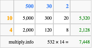 That's all there is to it! As you can see from the box above, the answer to 532 times 14 using the box method is 7,448.