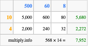 Below is an illustration showing you how to calculate 568 times 14 using the box method, using the instructions above.