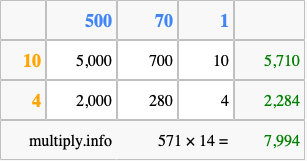 That's all there is to it! As you can see from the box above, the answer to 571 times 14 using the box method is 7,994.