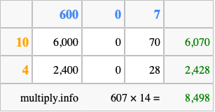 That's all there is to it! As you can see from the box above, the answer to 607 times 14 using the box method is 8,498.