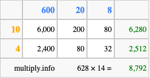 That's all there is to it! As you can see from the box above, the answer to 628 times 14 using the box method is 8,792.