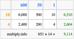That's all there is to it! As you can see from the box above, the answer to 651 times 14 using the box method is 9,114.