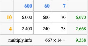 That's all there is to it! As you can see from the box above, the answer to 667 times 14 using the box method is 9,338.