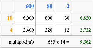 That's all there is to it! As you can see from the box above, the answer to 683 times 14 using the box method is 9,562.
