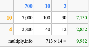 Below is an illustration showing you how to calculate 713 times 14 using the box method, using the instructions above.